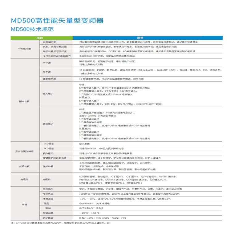 高性能矢量控制,提高設備精度;支持多種編碼器,高精度閉環控制;低速大轉矩,提高設備低速控制性能;30kW以上系列標配內置H級絕緣等級直流電抗器